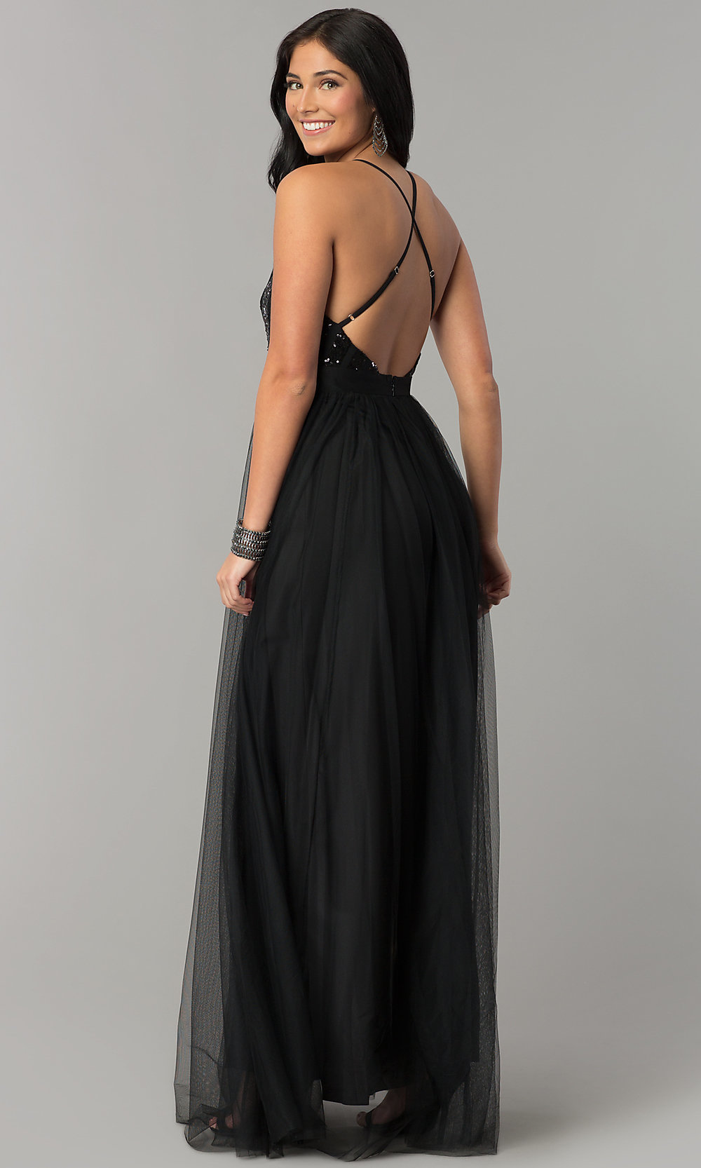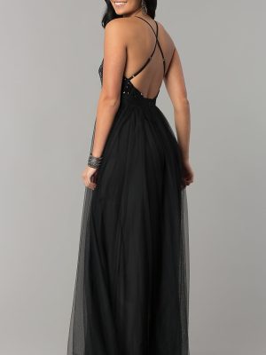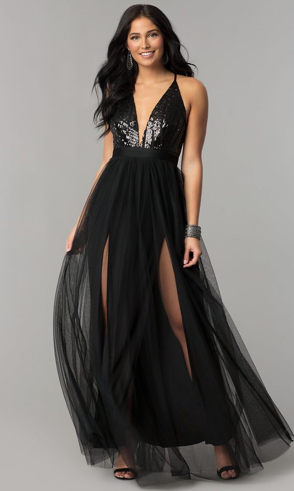 Vestido negro con aberturas en pierna, busto en lentejuelas, cruzado en la espalda; disponible en talla S, M y L.